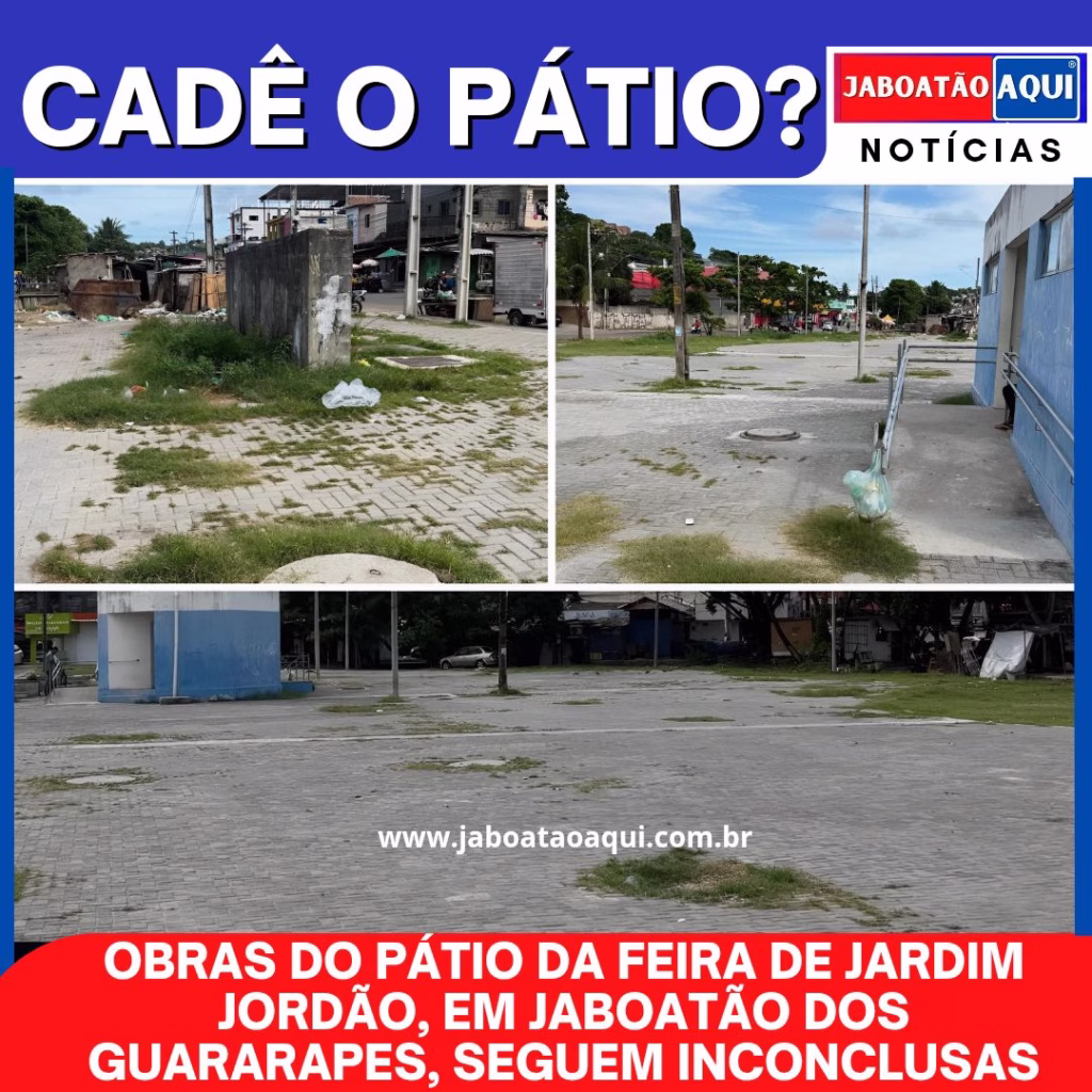 ➡️ As obras do Pátio da Feira de Jardim Jordão, no município de Jaboatão dos Guararapes, seguem sem conclusão, mesmo após o prazo inicialmente previsto para junho de 2024. O projeto chegou a ser vistoriado no início da execução pelo prefeito Mano Medeiros, mas até o momento o equipamento público não foi finalizado.