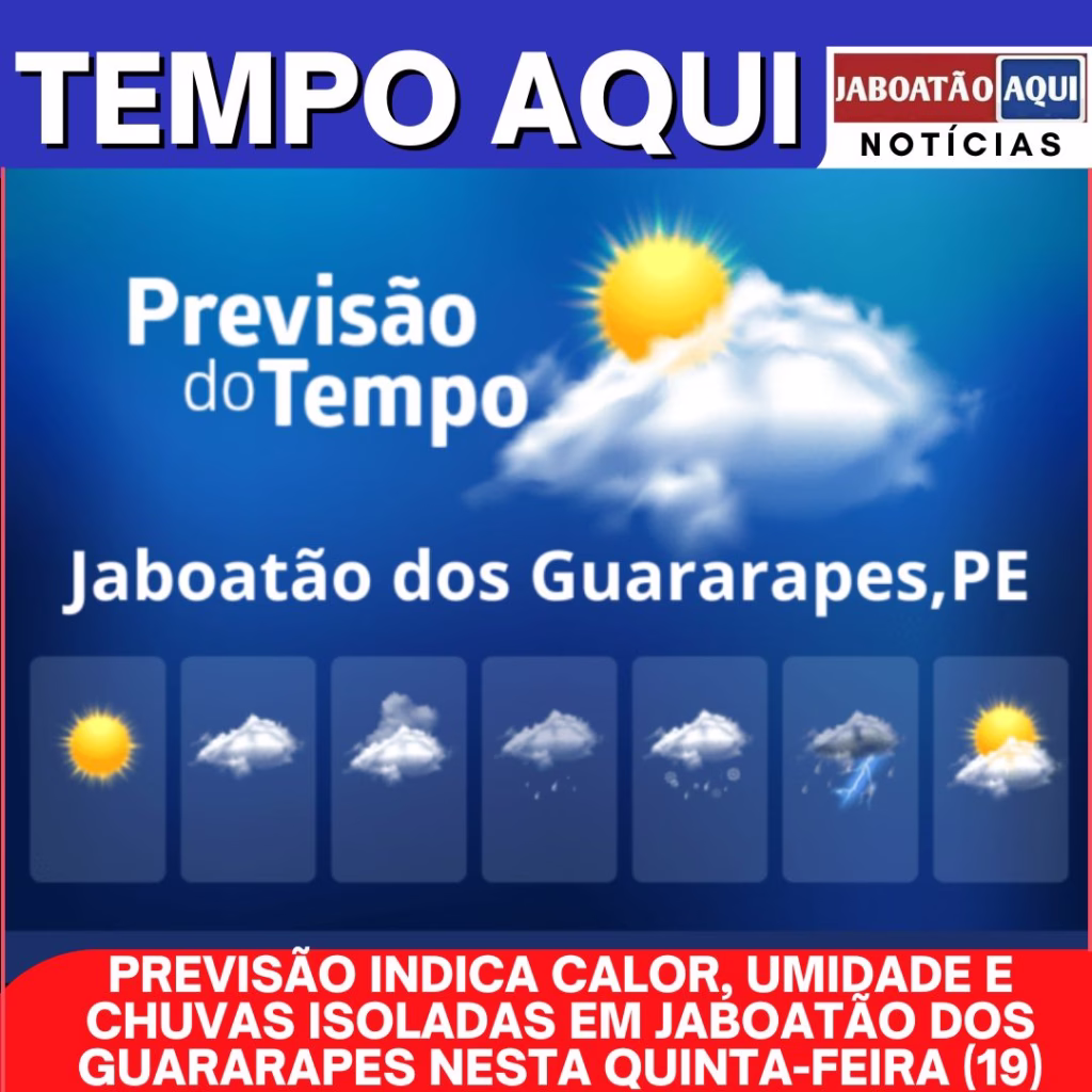 ➡️ O município de Jaboatão dos Guararapes terá uma quinta-feira (19) marcada por temperaturas elevadas, alta umidade e possibilidade de chuvas rápidas ao longo do dia. O cenário climático segue o padrão típico do litoral pernambucano, com calor predominante e variação de nuvens.